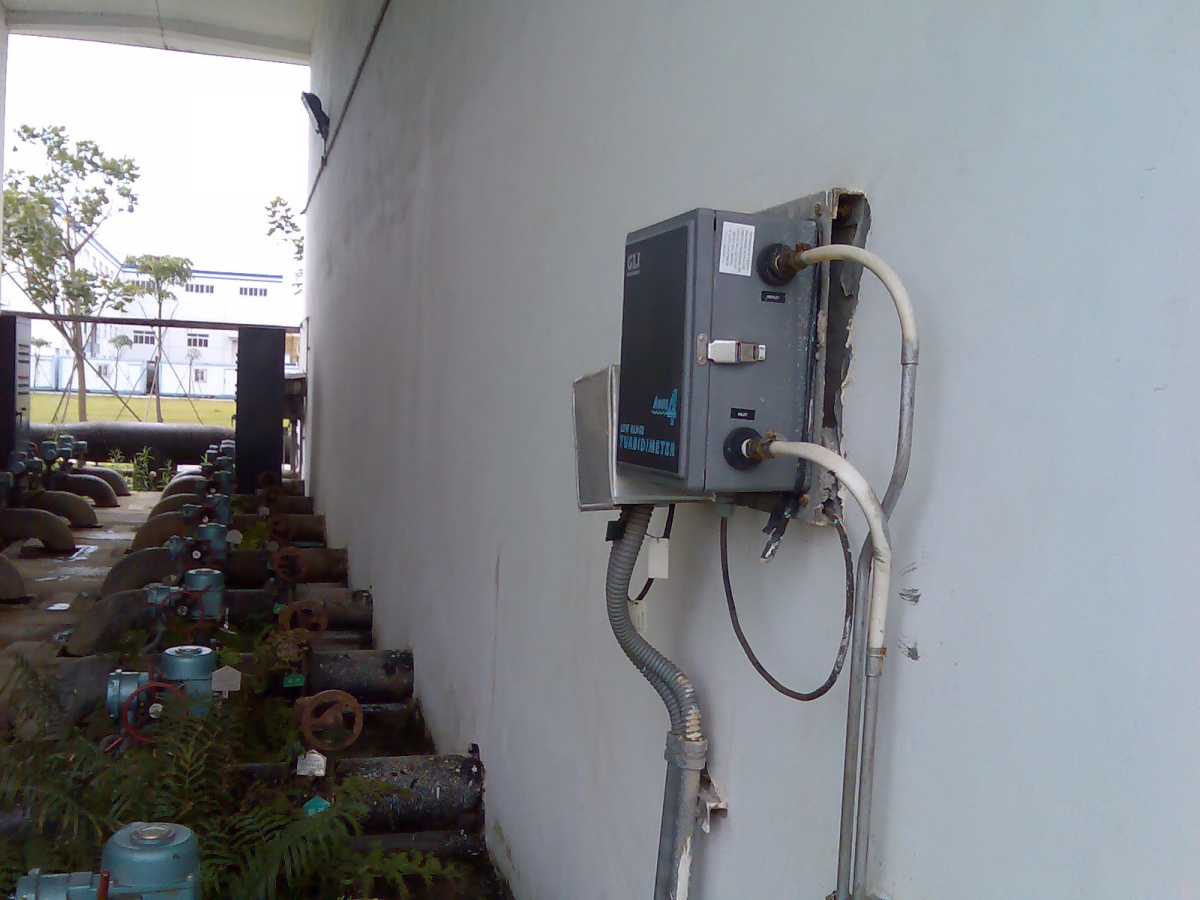 我廠凈水站整套設備由常州江南電力設備集團有限公司提供。由兩套機械石英砂過濾器和二氧化氯加藥設備制備生活用水、兩組沉淀池以及對應的絮凝劑和助凝劑加藥設備制備工業(yè)水組成。由于考慮到工業(yè)用水和生活用水對濁度的要求較高,機械石英砂過濾器出口濁度和沉淀池出口濁度,是生活水和工業(yè)水出水合格的標準,因此要求廠家提供測量穩(wěn)定可***的濁度計,通過與常州江南電力設備集團有限公司溝通協(xié)商選用由GLI Division of HACH CO.生產(chǎn)型號為8320T1A0C3NC測量裝置和型號為T53A4A2N二次儀表組成的濁度儀。