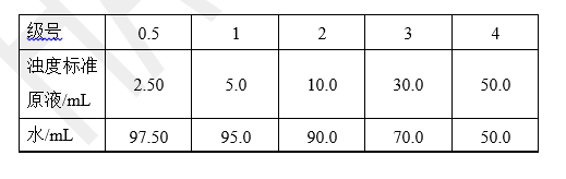 濁度標(biāo)準(zhǔn)液的制備 取濁度標(biāo)準(zhǔn)原液與水,按下表配制,即得。本液應(yīng)臨用時(shí)制備,使用前充分搖勻。